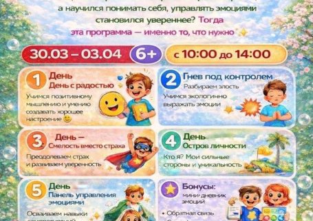 Эмоции - это не слабость, а суперсила, если уметь ими управлять!Приглашаем детей 6+ на яркую 5-дневную программу, где ребёнок: научится понимать себя справляться со страхами и злостью станет увереннее и спокойнее прокачает общение с другимиКаждый день - важный навык через игру, творчество и живые эмоции Когда? 30.03–03.04 В какое время? с 10:00 до 14:00Адрес: Коломенская ул., 12, корп. 3(вход сзади дома Полигло... Подробнее →