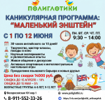 Представляем летнюю каникулярную программу «Маленький Эйнштейн» — уникальное сочетание естественных наук и английского языка для любознательных Полиглотиков!Пре... Подробнее →