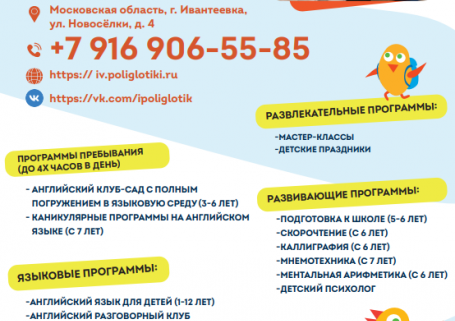 Методистами сети Детских Языковых Центров Полиглотики™ разработана уникальная методика, позволяющая в короткие сроки, всего за 3-6 месяцев, овладеть иностранным языком. Программы на русском языке, такие как скорочтение, ментальная арифметика, каллиграфия, мнемотехника, подготовка к школе и др., обеспечат интеллектуальное развитие ребенка.