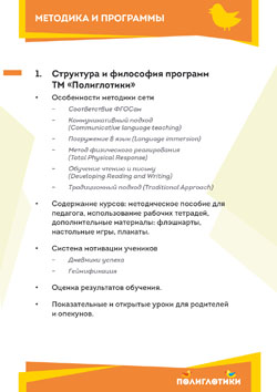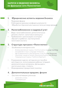 *** В базовый пакет входят более 90 курсов по 5 иностранным языкам (Английский, Китайский, Испанский, Немецкий, Французский). Пакет русский включает в себя дополнительные программы на русском языке: скорочтение, ментальная арифметика, каллиграфия, подготовка к школе по трем предметам, мнемотехника, раннее развитие для детей от года, логопедия, арт-терапия. Пакет курсов по программированию на английском языке. Всего более 90 курсов. В пакет онлайн включена возможность проведения занятий на платформе poliglotiki.com, а также доступ к онлайн инструментарию: тесты, тренажеры, игры, аудио и видео контент для проведения дистанционных и очных занятий. Продажа франшизы в крупных городах осуществляется только с дополнительным пакетом.