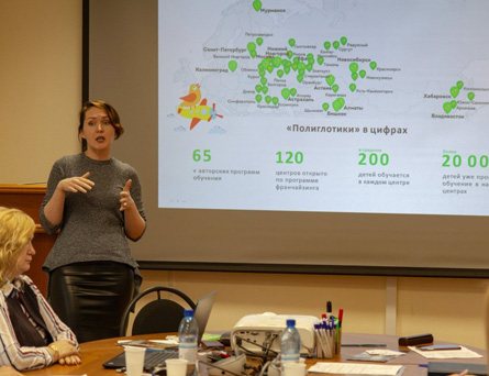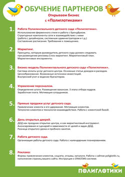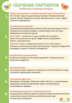 Регулярно, с периодичностью до трех раз в месяц, профильные специалисты сети Полиглотики проводят обучающие вебинары на прикладные темы: покупка оборудования, особенности образовательных программ, методические рекомендации, работа с детьми с отклонениями в развитии, маркетинговые мероприятия, ценообразование.