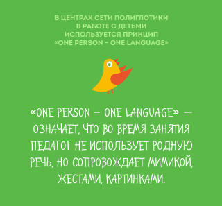Иностранный язык на занятии – это единственное средство коммуникации. Ребенок шаг за шагом осваивает язык в различных ситуациях по принципу билингвизма, изучая знакомые ему темы и понятия в игровой форме.