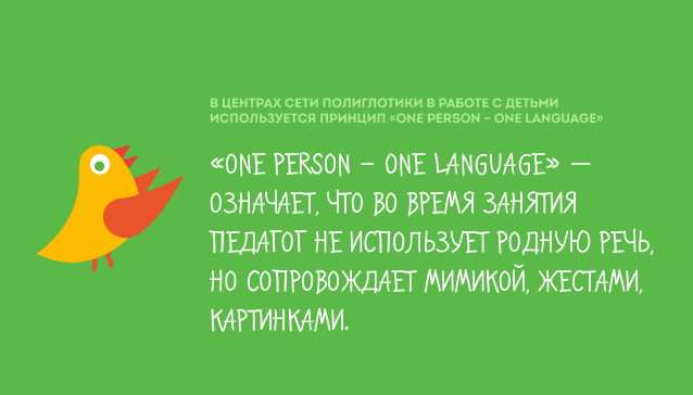 Методистами сети Детских Языковых Центров Полиглотики™ разработана уникальная методика, позволяющая в короткие сроки, всего за 3-6 месяцев, овладеть иностранным языком. Программы на русском языке, такие как скорочтение, ментальная арифметика, каллиграфия, мнемотехника, подготовка к школе и др., обеспечат интеллектуальное развитие ребенка.