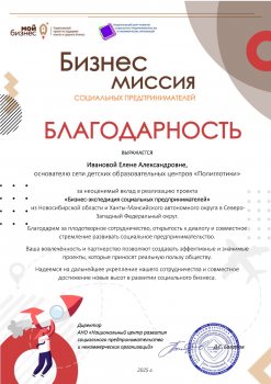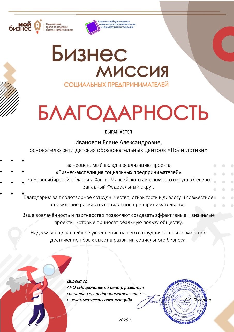 Елена Иванова, основатель сети детских образовательных центров «Полиглотики», получила благодарственное письмо от АНО «Национальный центр развития социального предпринимательства и некоммерческих организаций».